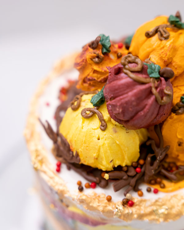 This pretty fall cake is the PERFECT centerpiece for your holiday gathering. This course emphasizes "painting" on buttercream, chocolate details, and rice crispy treat/truffle pumpkins.